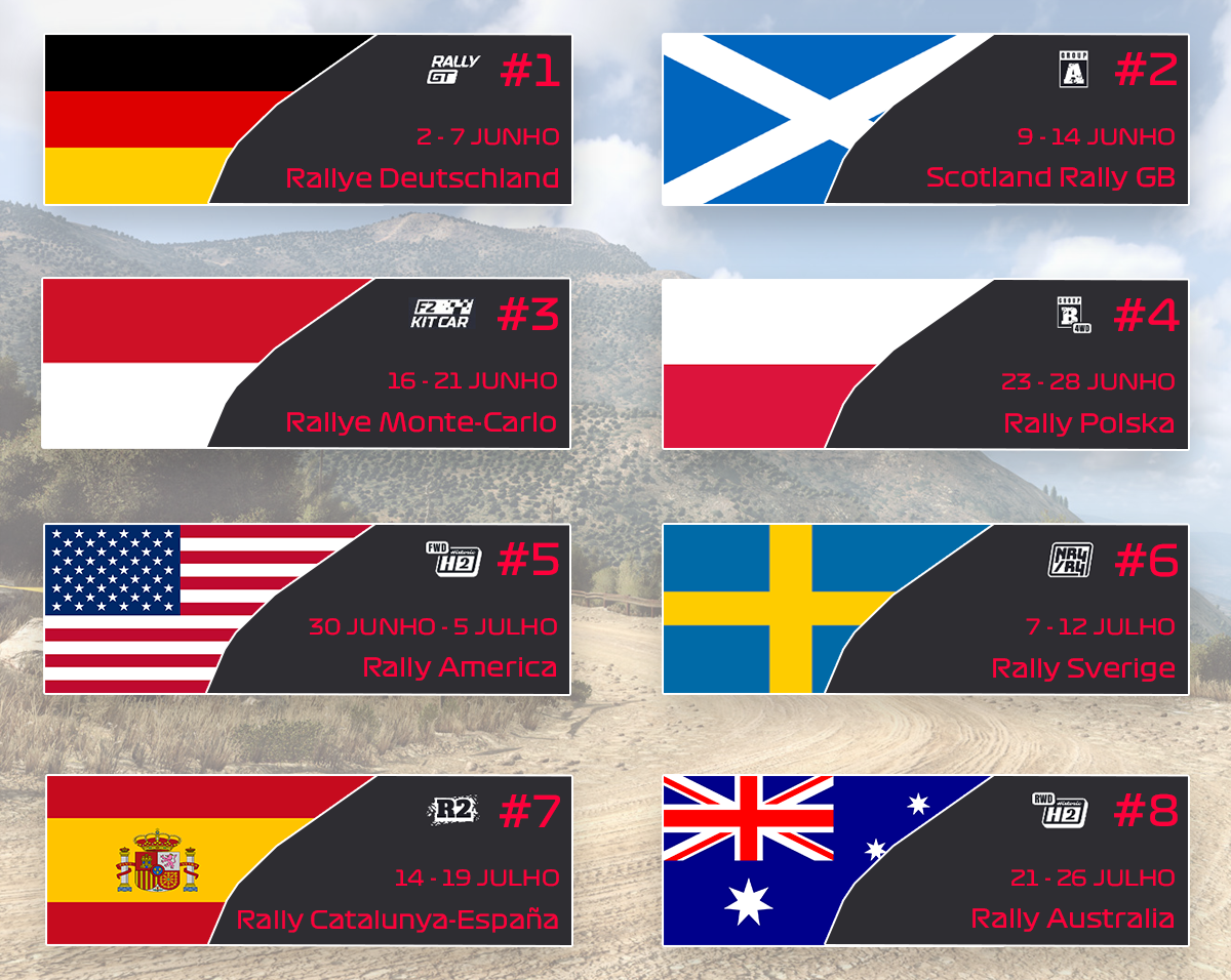 A jornada começa no asfalto da Alemanha com os poderosos Rally GT, passando de seguida para o mais recente país a ser adicionado, a Escócia, onde os Grupo A vão deixar a sua marca na gravilha. Daí até a Monte-Carlo e aos F2 Kit Car é um saltinho (e algum gelo), para de seguida a viagem parar na rápida Polónia com os ainda mais rápidos e temíveis Grupo B. Na passagem para os "States" serão os clássicos H2 FWD a brilhar. A neve da Suécia dará luta aos modernos NR4/R4, enquanto o quente asfalto da Espanha lidará com os ágeis R2. Por fim, o grande final está reservado para a Austrália, onde os H2 RWD vão mostrar que velhos são os trapos.